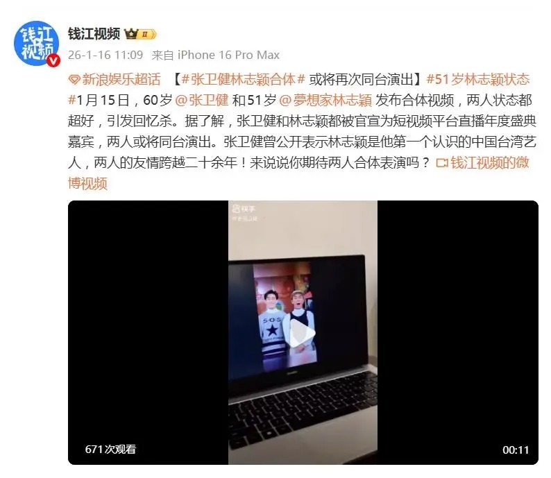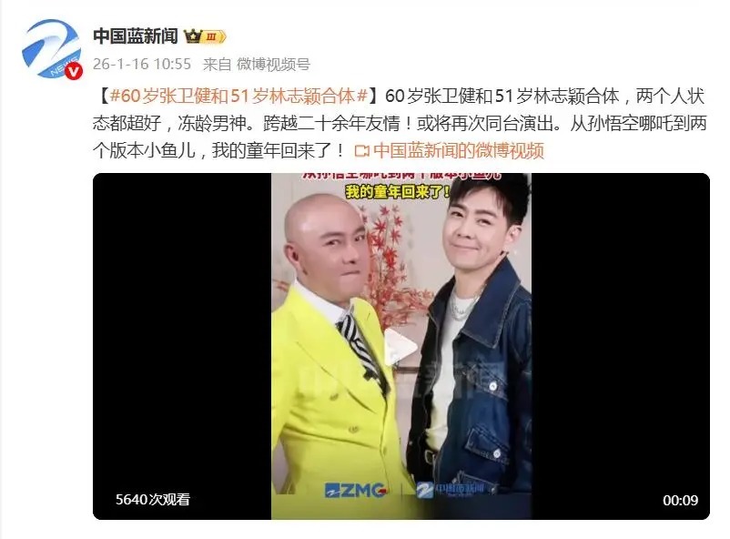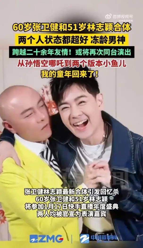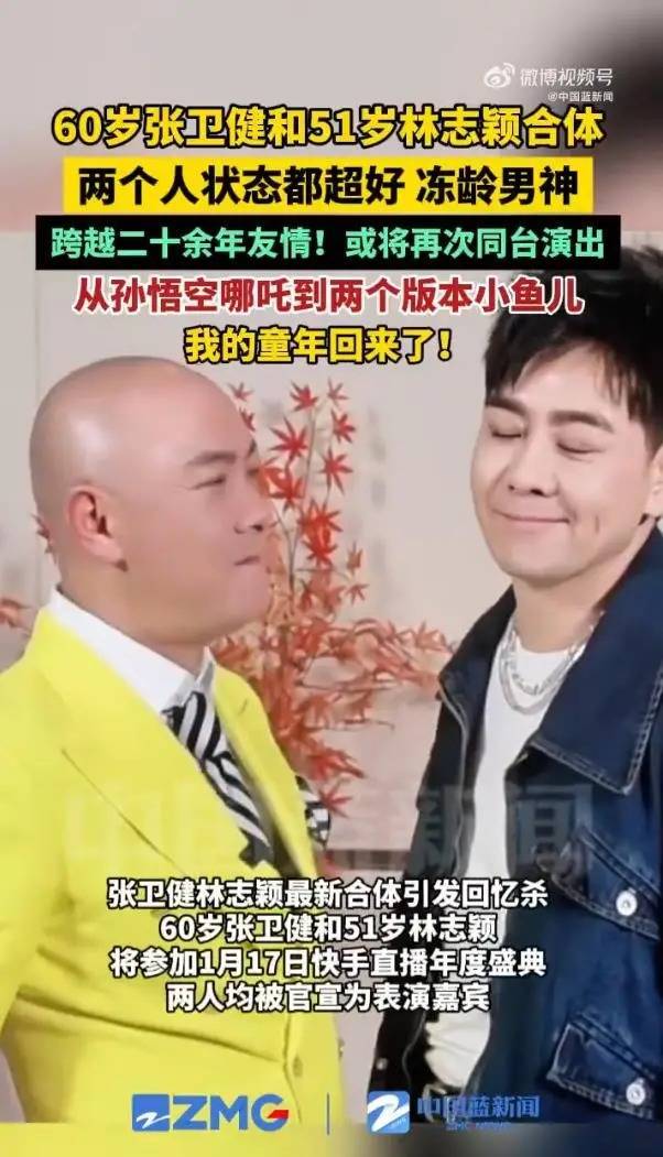 据1月16日报道,一段合体视频直接炸翻了一波80、90后的回忆——60岁的张卫健和51岁的林志颖同框互动,状态好到让人惊呼“时间是不是在他们身上卡住了?”更劲爆的是,两人这次合体可不只是叙旧,而是双双官宣成为某短视频平台直播年度盛典的嘉宾,这意味着,一场跨越二十多年的“爷童回”同台演出,很可能就要成真了!